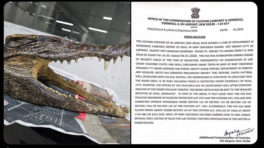 وقالت جمارك دلهي في بيان: "عند الفحص، تم اكتشاف جمجمة ذات أسنان حادة، تشبه فك تمساح صغير، وتزن حوالي 777 غراما، ملفوفة بقطعة قماش"، مبينة أنه تم القبض على الرجل وتسليم الجمجمة إلى إدارة الغابات والحياة البرية.
