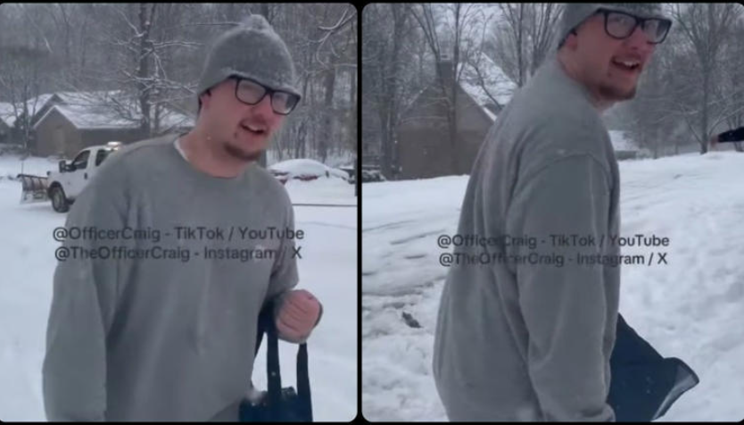 وشارك ضابط الشرطة مقطع فيديو تفاعلي على تطبيق TikTok الخاص به، يُظهر عامل توصيل بيتزا يسير عبر مسار مغطى بالثلوج.