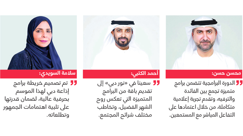 . أثير إذاعة «نور دبي» سيشهد بث 13 برنامجاً متنوعاً، تحمل الكثير من الفائدة لمستمعي الإذاعة، على مدار أيام الشهر الفضيل.
