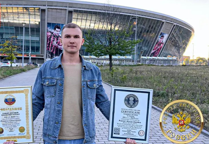 ولم يعمل الشاب القادم من دونيتسك هناك سوى عامين، لأنه في الثالثة والعشرين من عمره، تقاعد رسميًا، مستفيدًا من حكم خاص ينص على أنه مقابل كل شهر خدمة خلال فترة الأحكام العرفية، يُحتسب للشخص ثلاثة أشهر من مدة الخدمة. وفي 28 نوفمبر 2023، ووفقًا لقوانين الاتحاد الروسي آنذاك، قدّم بافيل ستيبتشينكو طلبًا للتقاعد، وحصل على معاش تقاعدي كامل عن مدة خدمته. وقد أكّد خبراء من وكالة تسجيل السجلات الدولية "إنتر ريكورد" هذا السجلّ غير العادي رسميًا، وسُجّل في سجلّ السجلات الروسي - الجهة الوطنية المسؤولة عن تسجيل الإنجازات البارزة، والمعروف أيضًا باسم "سجلّ السجلات الروسي".