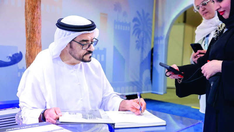 العوضي موقعاً كتابه في «أبوظبي للكتاب». من المصدر