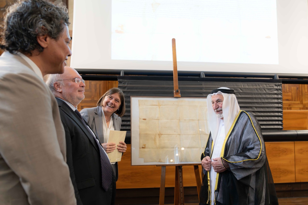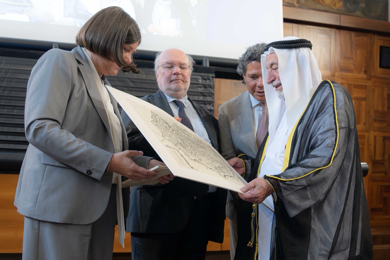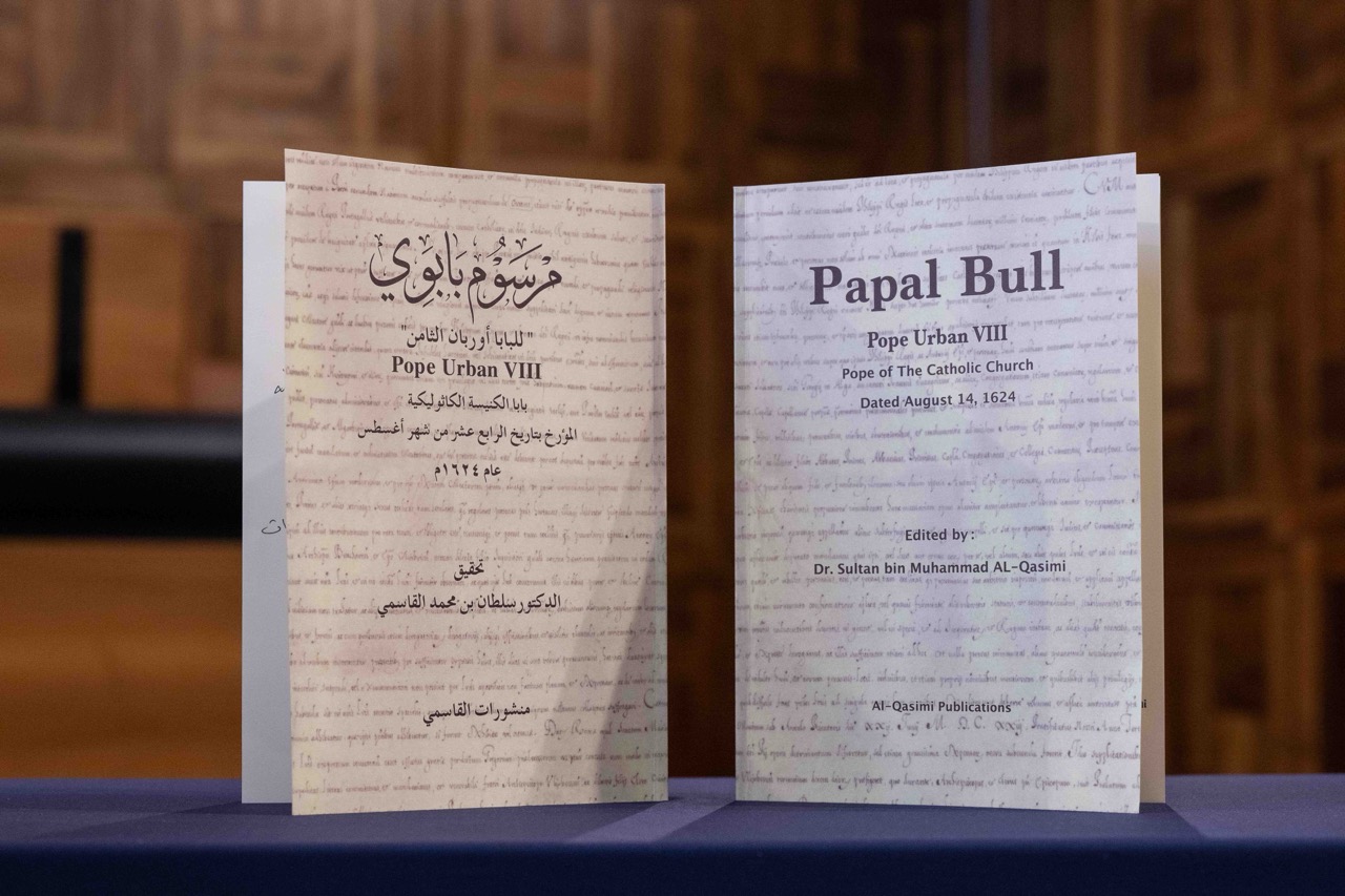 وتفضل صاحب السمو حاكم الشارقة بالتوقيع على كتاب "مرسوم بابوي للبابا أوربان الثامن، بابا الكنيسة الكاثوليكية المؤرخ بتاريخ 4 أغسطس 1624م" باللغتين العربية والإنجليزية، وخط سموه في الكتاب المُهدى للجامعة كلمات جاء فيها "أهديكم هذا الكتاب الذي وثقت فيه، بالتقصي والبحث والعدالة، كثيراً من التفاصيل والحقائق عن مرحلةٍ مهمة من تاريخنا وتاريخكم. جمعت قصاصات حقيقته من العالم، ووثقتها في الشارقة، وأتركها لكم وللمستقبل". ويُعتبر الإهداء مساهمة معرفية تعكس التزام الشارقة بتوثيق التاريخ وتعزيز التواصل الثقافي مع المؤسسات العلمية العالمية.