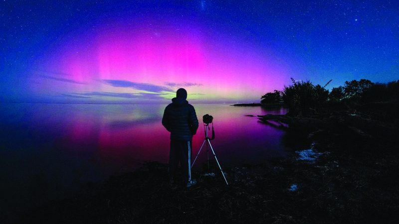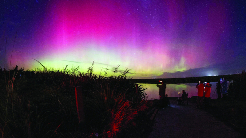 خرج الناس، أمس، في نيوزيلندا لمراقبة ظاهرة نادرة تعرف باسم «الأضواء الجنوبية»، أو الشفق القطبي الجنوبي، حيث الضوء الذي تمتزج فيه الألوان يتوهج في الأفق فوق بحيرة إليسمير في لينكولن على مشارف كرايستشيرش.