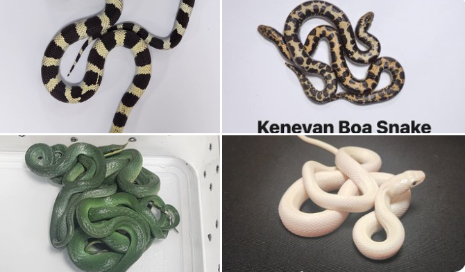 وشملت الثعابين الحية زواحف تُباع غالبًا في تجارة الحيوانات الأليفة، وكانت في معظمها غير سامة، أو ذات سم ضعيف جدًا بحيث لا يؤثر على الإنسان. ونشرت الجمارك صورًا على مواقع التواصل الاجتماعي للثعابين التي عُثر عليها. وشملت أفاعي الرباط، وأفعى كاليفورنيا كينغ الساحلية، وأفعى وحيد القرن، وأفعى رملية كينية، وغيرها.