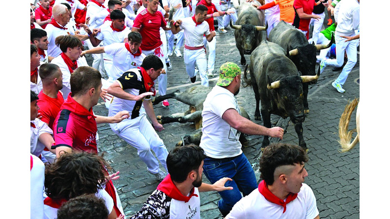 وشهد المسار الضيق المتعرج البالغ طوله 800 متر والمؤدي إلى حلبة مصارعة الثيران، العديد من عمليات السقوط، كما أظهر البث على قناة «آر.تي.في.إي» الإسبانية.