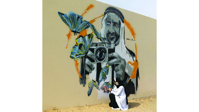هند خالد تضع لمساتها على جدارية تتزين بصورة الشيخ راشد وهو يحمل كاميرا تخرج منها الفراشات للإيحاء بالفرح والأمل. تصوير: شيماء محمد