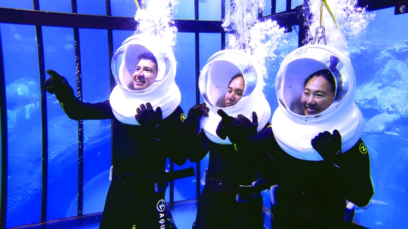 لأصحاب القلوب القوية وعشاق البحر والغوص، يوفّر «أكواريوم» تجربة غوص كاملة داخل الحوض الضخم. ويُمكن للزائر أن يرتدي عدة الغوص الكاملة ويغوص وسط العشرات من أسماك القرش والراي، تحت إشراف غواصين محترفين، هذه التجربة مخصصة لحاملي شهادات الغوص، لكنها تتيح أيضاً برنامجاً تعليمياً مبسطاً لمن لا يمتلكون تلك الشهادات، ليتمكنوا من خوض التجربة بعد تدريب قصير، أمّا التجربة الأكثر تخصصاً فهي ما يُعرف باسم Speciality Dive، التي تشمل ثلاث جلسات غوص تدريجية، إحداها تركز على تصوير أسماك القرش عن قرب، وأخرى تتيح للمشارك فرصة المشاركة الفعلية في عملية الإطعام.