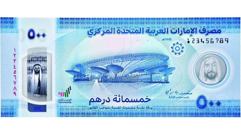 أما الورقة النقدية الجديدة من فئة الـ500 درهم، التي صدرت بالتزامن مع احتفالات الدولة بعيد الاتحاد الـ52، فصممت لتجسد الدور الريادي الدولي لدولة الإمارات في العمل المناخي والمستقبل المستدام، فتضمن الوجه الأمامي صورة جناح الاستدامة «تيرا» في مدينة إكسبو دبي، وتضمن الوجه الخلفي صورة مبنى متحف المستقبل في دبي، الذي اختير كأجمل مبنى في العالم، وصورة لأبراج الإمارات، بالإضافة إلى صورة برج خليفة على يمين الورقة.