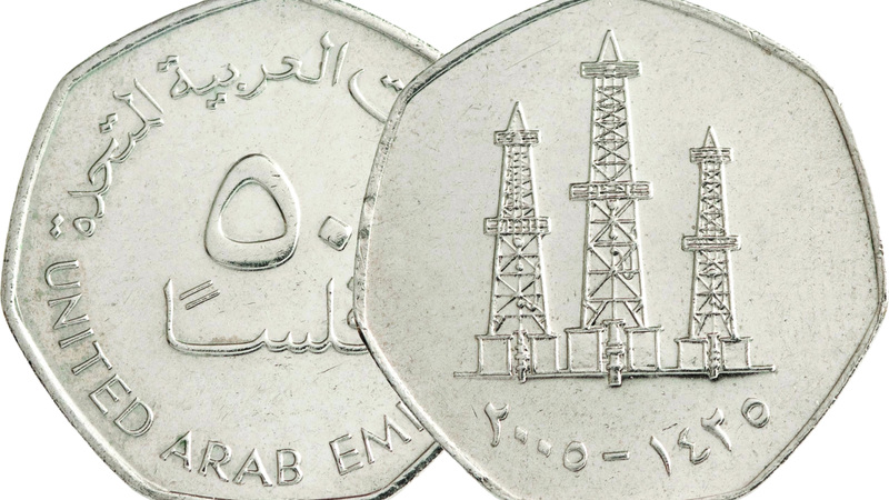 بينما تضم عملة نصف الدرهم النقدية صورة لثلاث منشآت نفطية في إشارة إلى مساهمة النفط في نهضة الدولة. وتحمل عملة الـ25 فلساً صورة غزال المها وهو من الحيوانات الجميلة التي تستوطن صحاري الدولة.