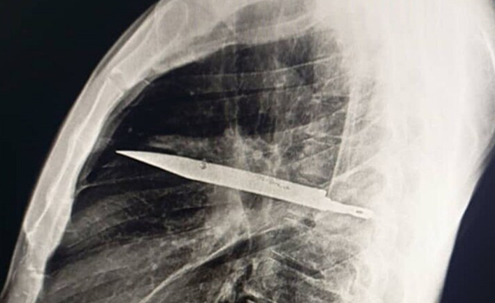 ونشر أطباء مستشفى موهيمبيلي الوطني في تنزانيا مؤخرًا دراسة حالة غير عادية في مجلتهم العلمية "المكتبة الوطنية للطب". وشرحوا حالة رجل يبلغ من العمر 44 عامًا يتمتع بصحة جيدة بشكل عام جاء إلى المستشفى بتاريخ طويل من إفرازات صديدية بيضاء من حلمة ثديه الأيمن. وقال التقرير أن المريض أنكر أي ألم في الصدر أو صعوبة في التنفس أو سعال أو حمى، لكنه سُئل عما إذا كان لديه أي شيء جدير بالذكر ليخبر الأطباء، فتذكر مشاجرة عنيفة قبل ثماني سنوات، أصيب خلالها بعدة جروح في وجهه وظهره وصدره وبطنه، حيث تمكن الأطباء من خياطة الجروح آنذاك، وعاش حياة هادئة في الغالب منذ ذلك الحين، حتى بدأت حلمة ثديه تفرز صديدًا. ولم يتمكن الأطباء من تحديد السبب، فأمروا بإجراء فحص بالأشعة السينية، ليصدموا برؤية نصل سكين ضخم عالق في صدر الرجل. وكتب الأطباء في دراسة الحالة: "أظهر التصوير الأولي بالأشعة السينية الجانبية للصدر وجود جسم معدني عالق في منتصف الصدر، مع وجود تعتيم محيط به، يُحتمل أن يُمثل ورمًا دمويًا موضعيًا مزمنًا أو تليفًا ما بعد الصدمة، وهو أحد مضاعفات طعنة المريض".