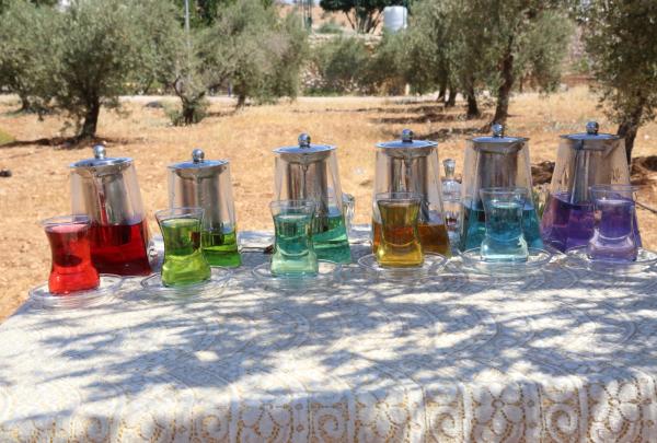 بألوانٍ تتدرج ما بين البنفسجي والأزرق والأخضر والأحمر كقوس قزح، تتلألأ أكواب الشاي في "مزرعة الشاي الأزرق الأردني" بمدينة الرمثا، شمال الأردن، حيث يقدمها صاحب أول مزرعة للشاي الأزرق في الأردن، راتب أبو دية.