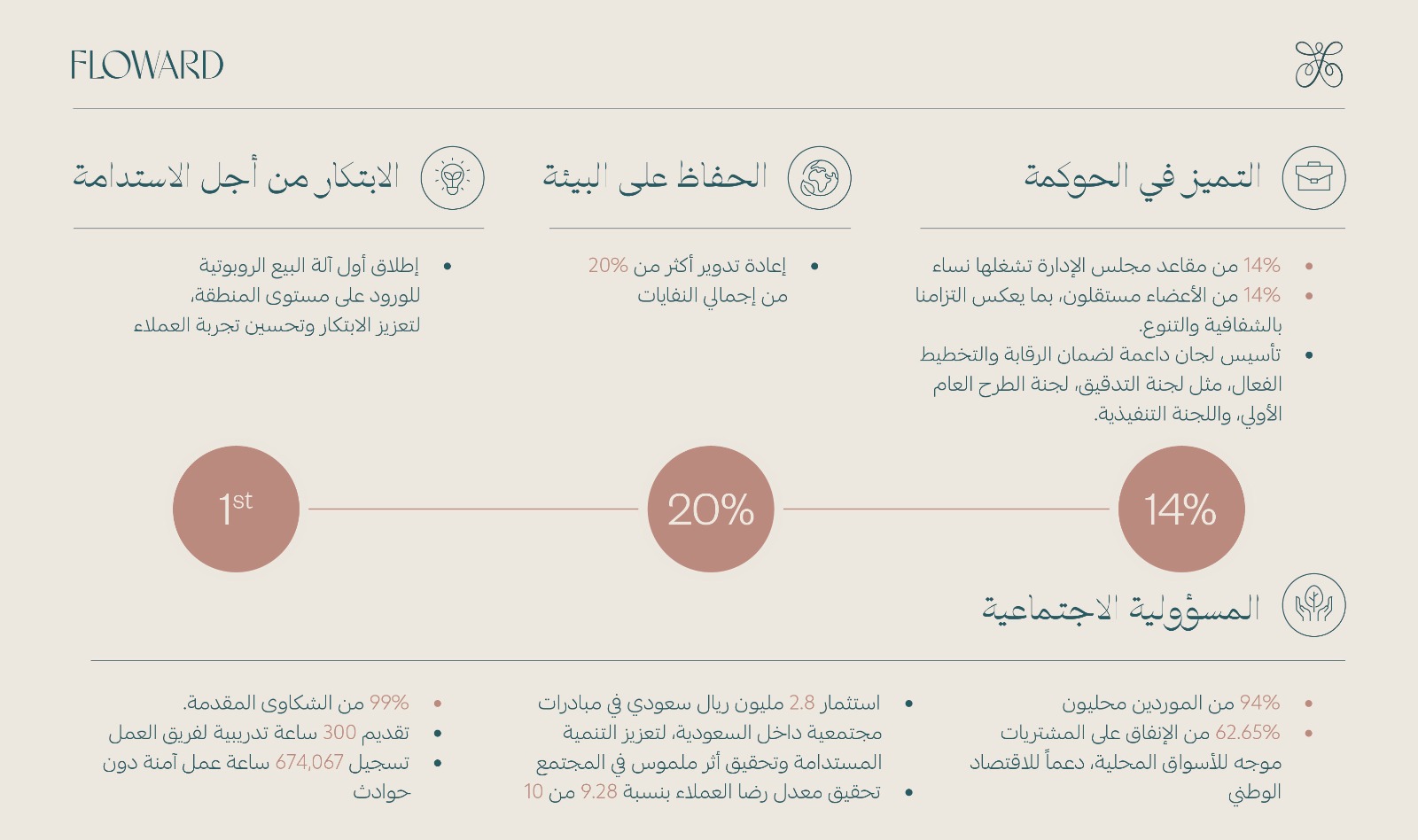 ويوضح التقرير أربعة محاور رئيسية تُشكّل استراتيجية فلاورد: الحفاظ على البيئة، المسؤولية الاجتماعية، التميز في الحوكمة، والابتكار من أجل الاستدامة. ومن خلال هذه الأعمدة، حققت فلاورد في عام 2024 عدداً من الإنجازات البارزة، من أبرزها: بناء شراكات لإعادة التدوير والاقتصاد الدائري في السعودية والكويت والإمارات، استثمار ما يقارب 2.8 مليون ريال سعودي في المبادرات المجتمعية في المملكة فقط، فضلًا عن أن 94% من موردي الشركة يتمركزون داخل المملكة العربية السعودية مما يؤكد دعمها للاقتصاد الوطني وتعزيز استدامة سلاسل التوريد.