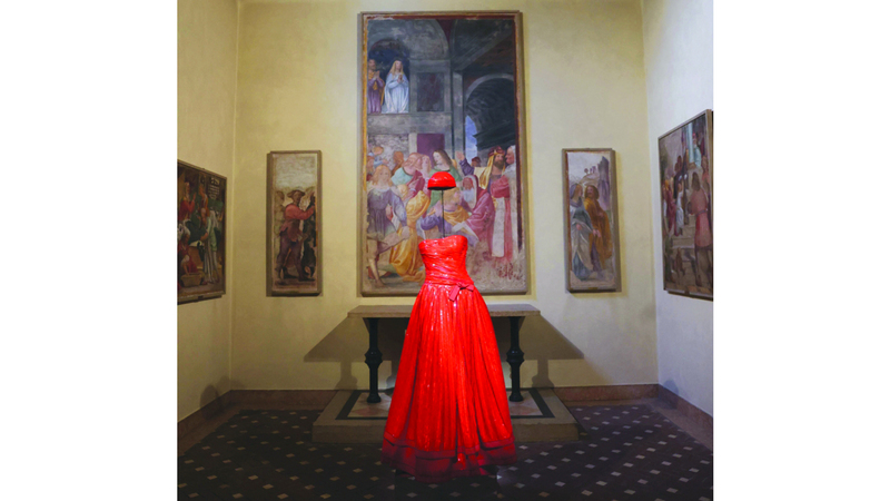 وفي إحدى القاعات، عُرضت تنورة وقميص أزرق من تصميم أرماني، ارتدتهما الممثلة الفرنسية جولييت بينوش في مهرجان كان السينمائي عام 2016، مقابل لوحة «العذراء والطفل» للرسام جوفاني بيليني. ويظهر حجاب العذراء الأزرق في تناغم مع مجموعة المصمم.