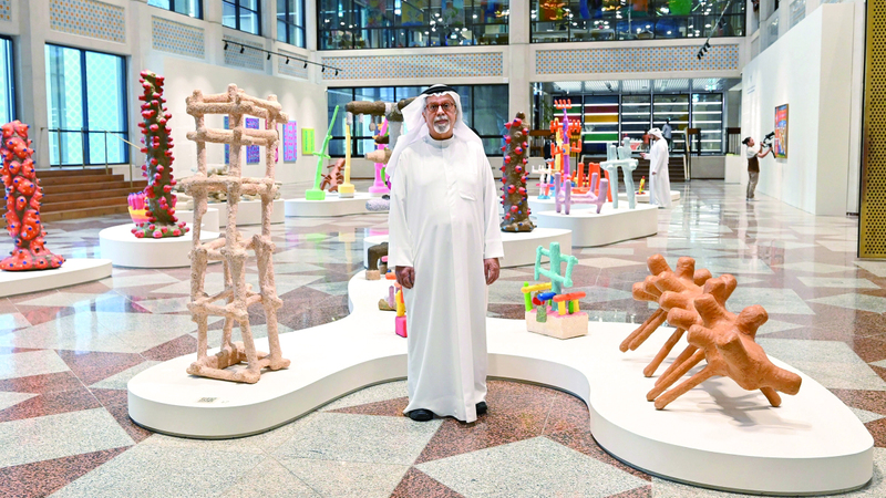 محمد أحمد إبراهيم بين أعماله في المعرض. تصوير: إريك أرازاس