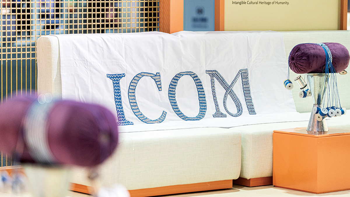 ويُبرز التصميم شعار «آيكوم» بدرجتين من اللون الأزرق، منسوجتين باستخدام أربع غرز تلي تقليدية، هي: «فنخ البطيخ»، و«بروي/المشارة»، و«الفن»، و«الكولي». وتمثل كل غرزة إرثاً فنياً يعكس مهارة الحرفيات، ويجسد تنوع النسيج الثقافي الإماراتي، فيما تتكامل هذه الغرز معاً لتجسيد شعار المؤتمر «مستقبل المتاحف في مجتمعات سريعة التغيير». ومن خلال تداخل هذه النقوش وانسجامها، تتشكل لوحة فنية تعبّر عن وحدة التنوع عبر مزج الأصالة مع الابتكار، وتُبرز مكانة الثقافة جسراً للتواصل بين الشعوب، ومنصة لاستشراف المستقبل، وتحتفي بالإبداع المتجذّر في التراث الإماراتي.