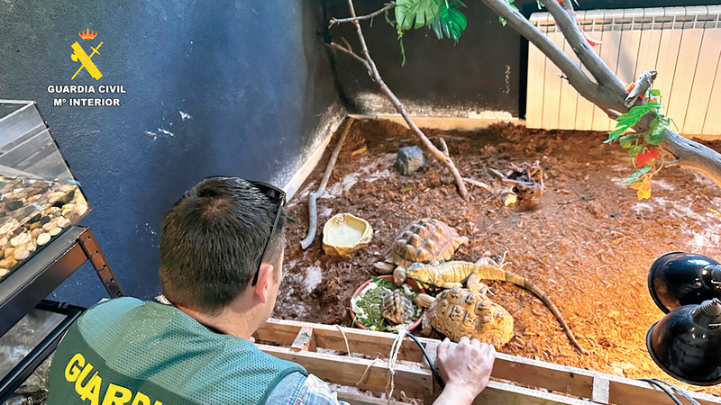 أعلنت الشرطة الإسبانية، أول من أمس، أنها داهمت محمية غير مرخصة، وأنقذت المئات من الحيوانات الغريبة وغير المألوفة، المستوردة بطريقة غير قانونية، من بينها سلاحف نمرية وسحالي الإغوانا والوزغ وغيرها.