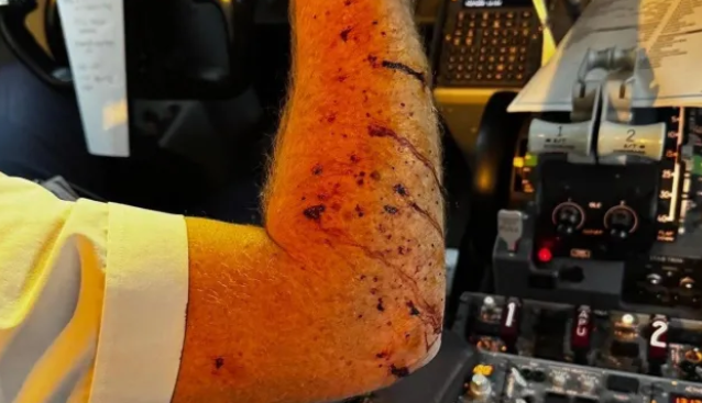 وتُظهر الصور المتداولة على الإنترنت ذراعي الطيار ينزفان، مع إصابات تتفق مع جروح الزجاج. كما غطى الزجاج المكسور لوحة القيادة وقمرة القيادة.