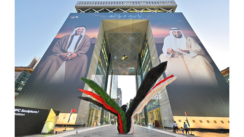 في ظلال صورتَي المغفور لهما الشيخ زايد بن سلطان آل نهيان، والشيخ راشد بن سعيد آل مكتوم، طيب الله ثراهما.. عمل فني يزهو بألوان علم الإمارات، ضمن «مسار المنحوتات» الذي يحتضنه مركز دبي المالي العالمي، ويرمز إلى ثبات الصقر قبل انطلاقه، واللحظة التي تستعد فيها أجنحته للتحليق والانطلاق إلى الأعالي.. وكأنه تحية إبداعية إلى وطن يحتفي بأجمل أيامه، حيث عيد الاتحاد الـ54.