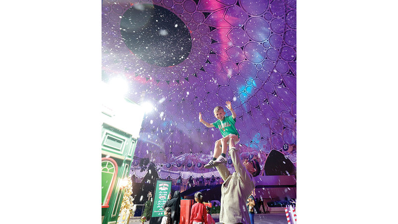 يبدو أن موسم الشتاء تحت قبة الوصل غير، حيث «يمطر» المعلم الأيقوني في مدينة إكسبو دبي «ثلجاً» ومرحاً، ويتزين بتشكيلات الألوان الزاهية، ليرسم الابتسامات على وجوه العائلات والأفراد، كما الحال هنا في لقطة الأب الذي يحمل ابنه لكي يلتقط «الثلج» مبكراً، وليضفي على المشهد فرحة إضافية، وسط مساحة تحفل بأنشطة تودّع الأيام الأخيرة في أجواء عامرة بالتفاؤل.