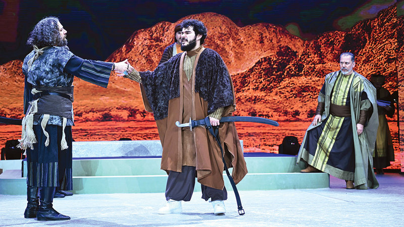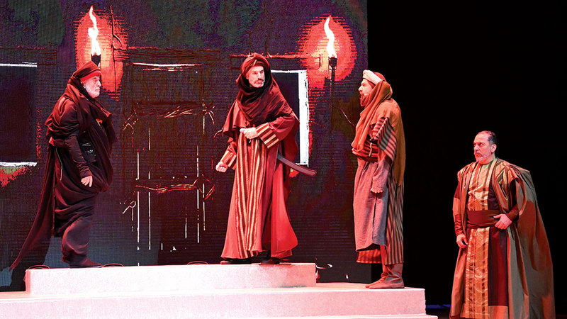 ويقدّم الممثل السوري سلوم حداد تجربته الإخراجية الأولى في هذا العمل، وتحدث لـ«الإمارات اليوم» عن هذه التجربة، قائلاً: «حاولنا أن نقدّم مقاربة بين المسلسل والمسرحية، وقد سعينا من خلال السينوغرافيا والمؤثرات الصوتية إلى الابتعاد عما قدّم في المسلسل، لأننا نعمل على عرض مسرحي وبالتالي الأثر والتأثير يكون أضخم»، ولفت إلى أن هذه المحاولة الإخراجية هي الأولى، متصوراً أن تكون الأخيرة، نظراً لما يتطلبه العمل في المسرح من مجهود وطاقة تفوق ما يتطلبه العمل الدرامي أو السينما، ونوه بأنه تم العمل على وضع مؤثرات معاصرة ورقصات تعبيرية، مع الحرص على أن ينتمي كل من النصّ والملابس للتاريخ، متأملاً أن يشهد عودة للمسرح، ومشيداً بمسرح المجاز المغري لتقديم عروض مسرحية، وأثنى حداد على تفاعل الجمهور مع العمل، متأملاً أن يحظى العرض بنجاح أكبر في الشارقة، أما في ما يخص أعماله الرمضانية، فلفت إلى أنه انتهى من تصوير مسلسلين، «عيلة الملك» من إخراج محمد عبدالعزيز، و«بنت النعمان» من إخراج سيف الشيخ نجيب، ويتابع تصوير «السوريون الأعداء» من إخراج الليث حجو، مشيراً إلى أن الدراما السورية هي في مرحلة التعافي، والقادم يبشر بالخير.