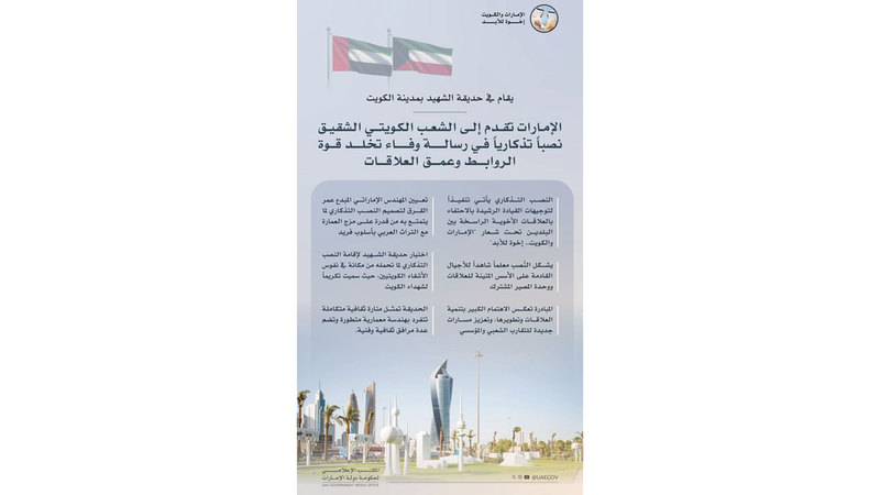 تنفيذاً لتوجيهات القيادة الرشيدة، بالاحتفاء بالعلاقات الأخوية الراسخة بين دولة الإمارات العربية المتحدة ودولة الكويت الشقيقة لمدة أسبوع في جميع إمارات الدولة، تحت شعار «الإمارات والكويت.. إخوة للأبد»، أعلنت حكومة دولة الإمارات عن نصب تذكاري مهدى من دولة الإمارات إلى الشعب الكويتي الشقيق، حيث سيتم إقامة النصب في حديقة الشهيد بمدينة الكويت. ويجسد إهداء دولة الإمارات النصب التذكاري إلى دولة الكويت رسالة وفاء للأشقاء تعكس عمق الأخوة المتجذرة بين البلدين والشعبين، وتخلد قوة الروابط، ويعد معلماً شاهداً للأجيال القادمة على الأسس المتينة للعلاقات ووحدة المصير المشترك.