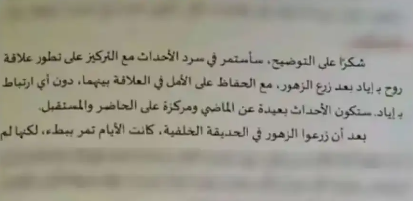وتظهر في إحدى تلك الروايات استجابة برنامج "شات جي بي تي" لتوجيهات مؤلف يريد كتابة نصه بالكامل عبر تلك التقنية، حيث يرد البرنامج عليه قائلا: "شكراً على التوضيح، سأستمر في سرد الأحداث مع التركيز على تطور علاقة (روح) بـ (إياد) بعد زرع الزهور مع الحفاظ على وجود الأمل في العلاقة بينهما".