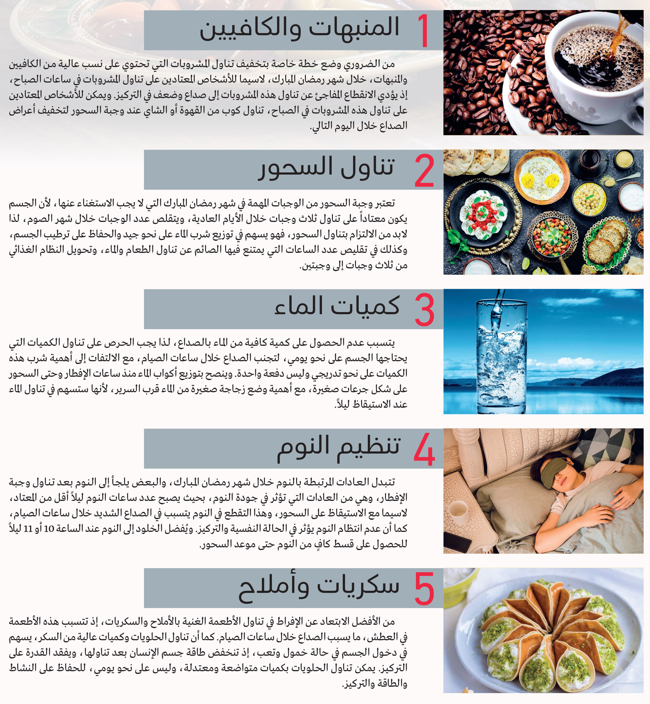 مع بداية شهر رمضان المبارك، يعاني الكثير من الصائمين الصداع في أول أيام الصيام، بسبب مجموعة من التغيرات المفاجئة التي تطال نمط الحياة اليومي، ومنها الامتناع عن تناول الطعام والشراب ساعات طويلة، ما يؤدي إلى انخفاض مستوى السكر في الدم، إضافة إلى الامتناع عن تناول الكافيين للمعتادين على شرب القهوة والشاي بكثرة، لاسيما في أوقات الصباح. وقدمت الاستشارية في طب الطوارئ في مستشفى فقيه الجامعي، الدكتورة رسل الجنابي، خمس نصائح تسهم في تخفيف حدة الصداع، وكذلك في تحسين مستوى التركيز خلال شهر الصيام.