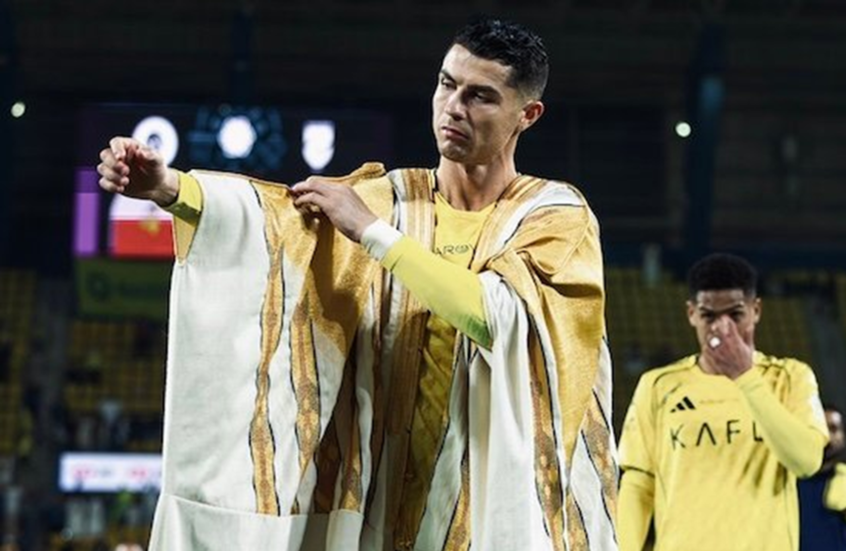 خطف اللاعب كريستيانو رونالدو الأنظار بظهوره مرتديا بشت "المعلّمة" الحساوي النادر، وذلك خلال احتفالات نادي النصر باستعادة صدارة دوري روشن التي تزامنت مع ذكرى يوم التأسيس في السعودية.