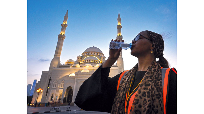 بعد أن أنجزت مهمتها الرمضانية في توزيع إفطار صائم، والإسهام في مشاهد الخير التي تملأ شوارع الإمارات وإشاراتها وساحاتها طوال الشهر الفضيل.. متطوعة من جمعية دبي الخيرية تفطر على قطرات من الماء أمام مسجد النور في الشارقة، حيث يتسابق كثيرون بين جنبات هذا الوطن المعطاء على المشاركة، والتنافس في تقديم يد العون، وتجسيد الأصالة والقِيَم السامية التي تكسو الإمارات بطولها وعرضها، وتُعدّ جزءاً من روحها الأصيلة.