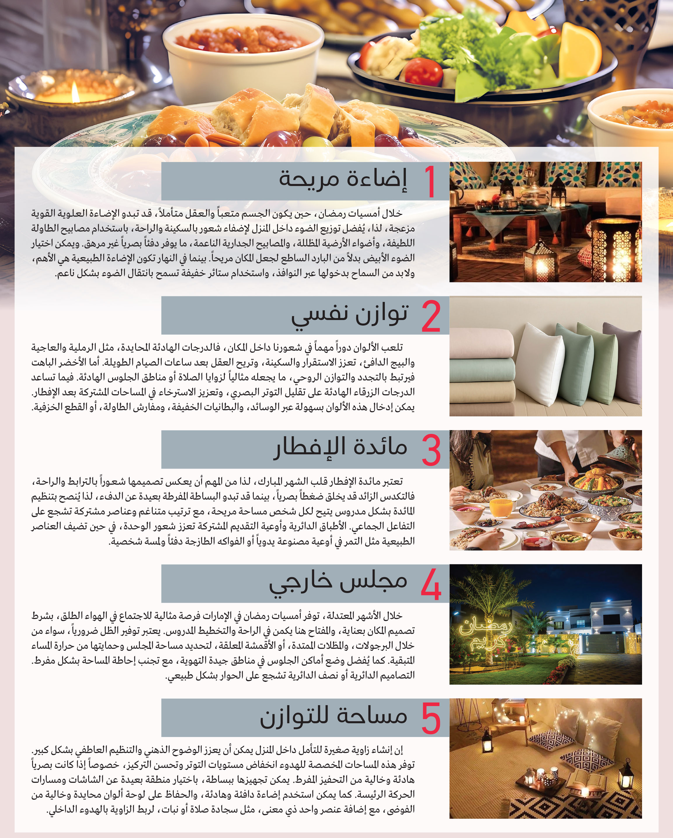 يمثل شهر رمضان المبارك السكينة والهدوء، فهو شهر التجمع العائلي والتأمل، لهذا من الممكن أن تحمل أجواؤه صدى خاصاً في المنزل، حيث يمكن التلاعب بمساحات المنزل وديكوره لتوفير الراحة والهدوء، وتعزيز الترابط العائلي، ما يضيف بعداً مميزاً لتجربة هذا الشهر، بدءاً من لحظات الإفطار المشتركة، وصولاً إلى أوقات التأمل والصلاة. وقدمت مؤسسة «إن كي للهندسة المعمارية»، ناتاليا ميلينك، خمس فِكَر مبتكرة وعملية لخلق بيئات منزلية تعزز الإحساس بالسكينة والراحة، لتجعل رمضان تجربة أكثر دفئاً وعمقاً.