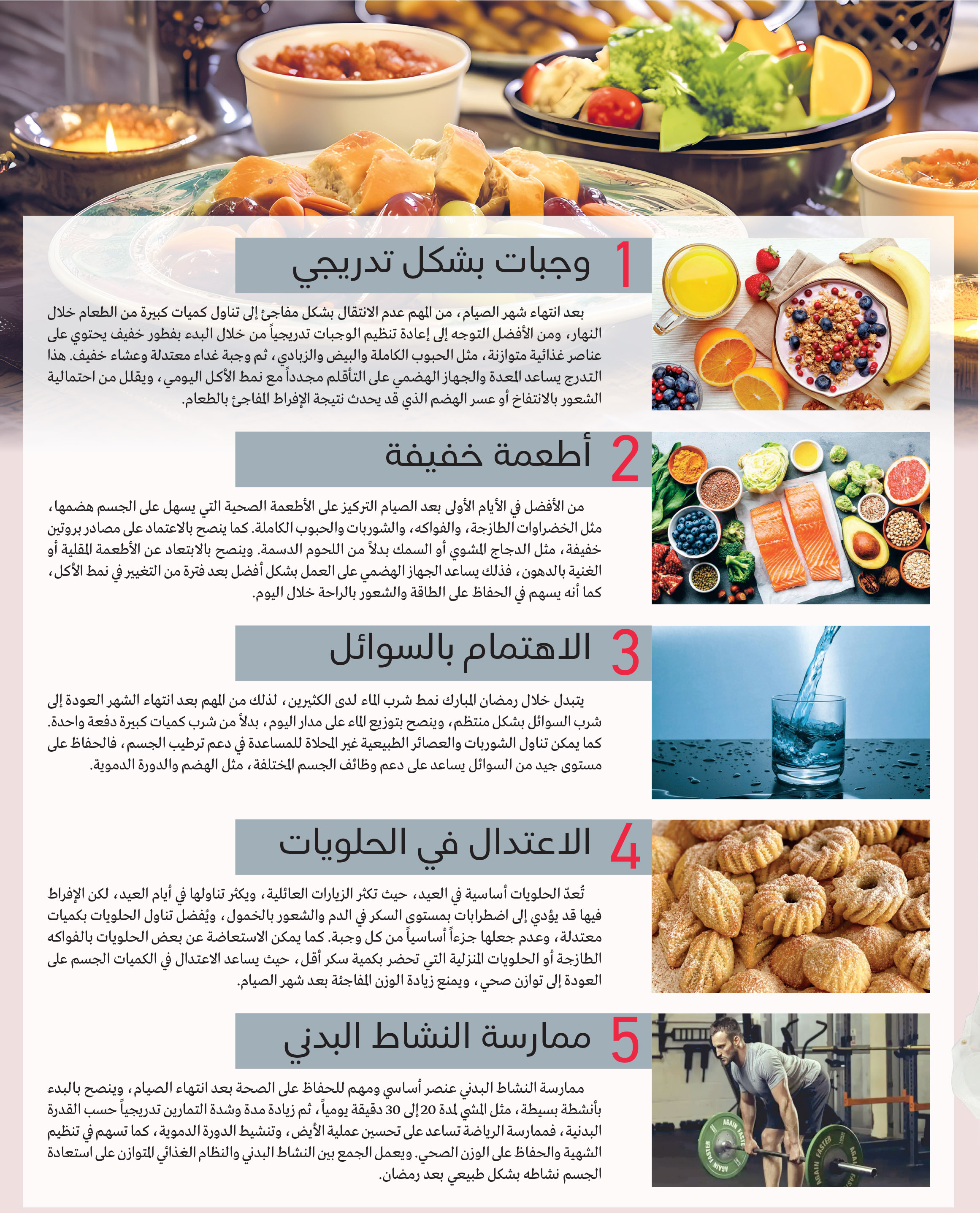 مع انتهاء شهر رمضان المبارك، وبعد فترة من التغيير في مواعيد تناول الطعام، يبدأ كثيرون بالنظر في العودة إلى نظام غذائي صحي، لا يقوم على تناول الكثير من الطعام، لتفادي زيادة الوزن أولاً، وكذلك لتجنب التلبك المعوي بعد اعتياد الجهاز الهضمي على تناول وجبتين فحسب. وأكّدت الأخصائية في التغذية في مستشفى فقيه الجامعي، تسنيم عبيد، أهمية العودة التدريجية إلى النظام الغذائي الصحي، مع مراعاة ما يمكن تناوله وكيفية توزيع الوجبات. وتالياً تقدم خمسة إرشادات أساسية للعودة إلى النظام الصحي بعد انتهاء شهر رمضان.