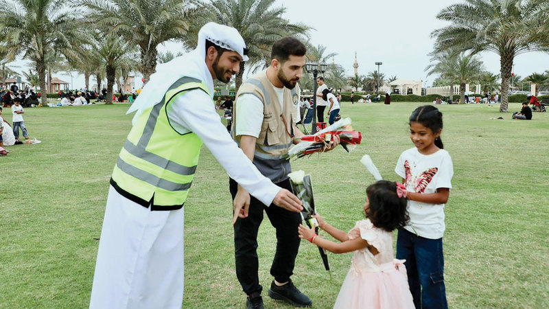 استقبال بالورود ورسائل التهاني بالعيد في الحدائق والمتنزهات