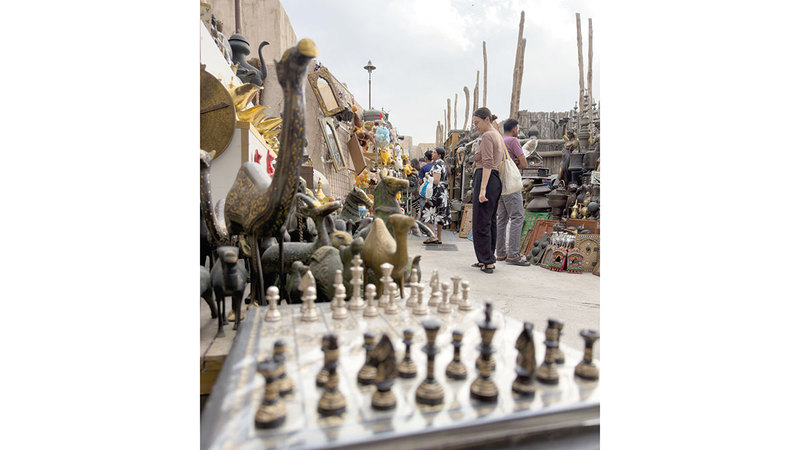 في ظل عبق التاريخ، ضيوف دبي يلقون نظرة عن قرب على معروضات متنوعة في سوق السيف، ويتأملون تحفاً وهدايا تذكارية، تتفق أغلبها بأنها تنتمي إلى الزمن الجميل، حيث يصحب المكان زواره إلى الماضي، ويقدم لهم قطعاً تستهوي عشاق الأصالة، سواء كانت رقعة شطرنج قادمة من بعيد، أو إطاراً مرصعاً بفنون الفسيفساء، أو نحاسيات منقوشة بحرفية وإتقان، وغيرها من الجماليات التي تضمها السوق التراثية.