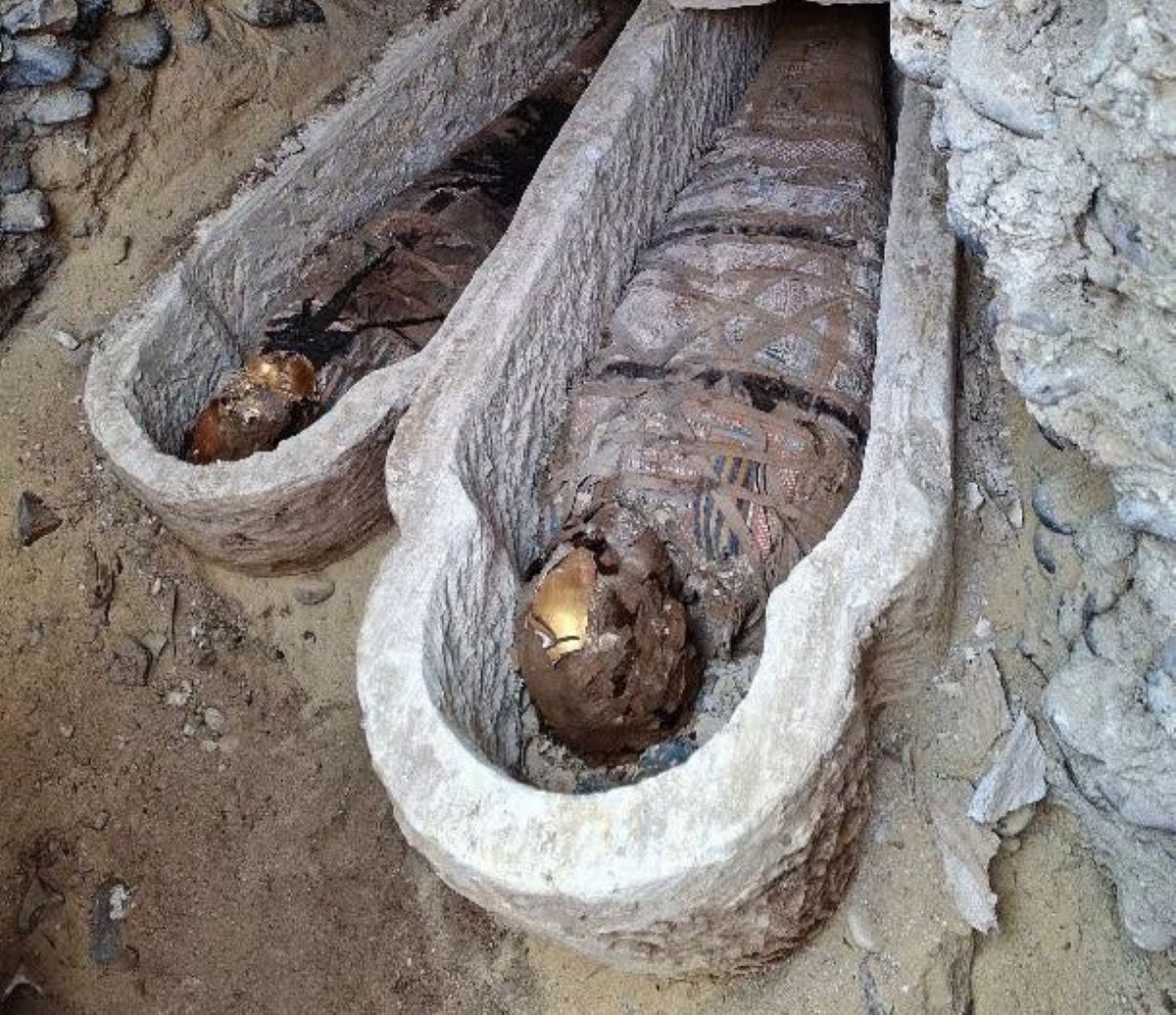 وذكرت الوزارة، في بيان، أن المومياوات "بعضها ملفوف بلفائف مزخرفة بزخارف هندسية"، مشيرة إلى أن البعثة عثرت أيضاً على "ثلاثة ألسنة ذهبية، وآخر من النحاس، فضلاً عن وجود دلائل على استخدام رقائق الذهب على بعض المومياوات".