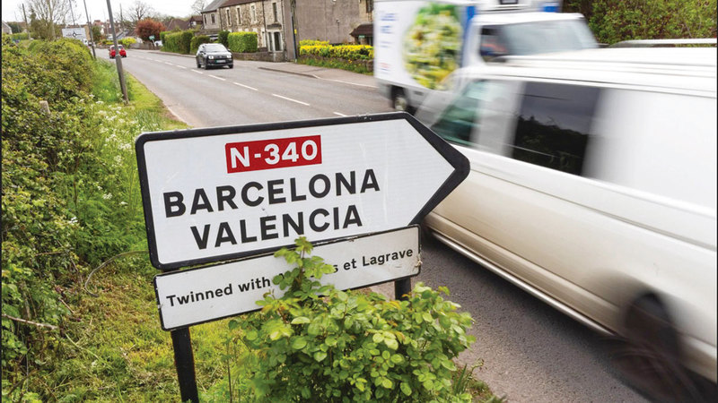 إشارة مرورية تحمل أسماء مدينتَي برشلونة وفالنسيا في بريطانيا. من المصدر