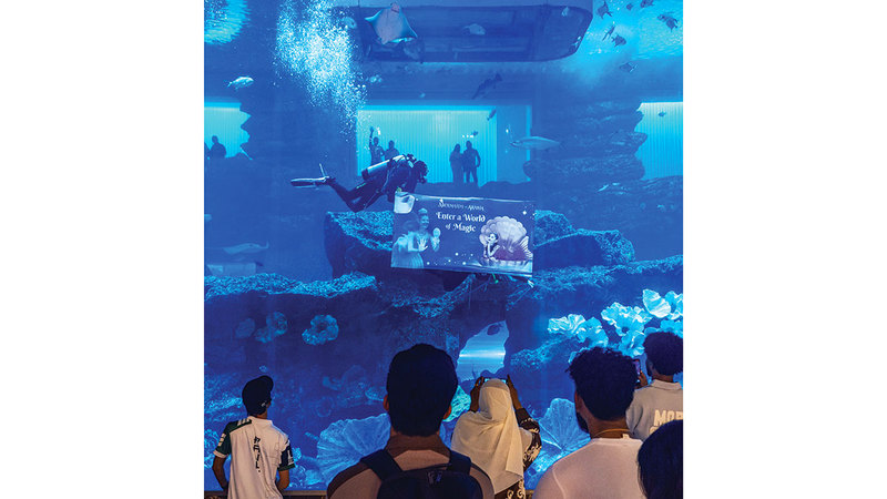 كل العيون على الرسالة القادمة من تحت الماء، سواء عيون الزوار، أو حتى عدسات الهواتف، حيث اللافتة التي يعرضها غوّاص في دبي أكواريوم وحديقة الحيوانات المائية، بأكبر مركز تسوق في العالم.. دبي مول، الذي لا يكف عن إبهار ضيوفه، ليس فقط بالمنتجات والمبتكرات وعوالم التسوق، بل أيضاً بكائنات عالم الأعماق، و«حوريات البحر»، والكثير مما تُدهش به هذه المدينة ضيوفها من حول العالم.