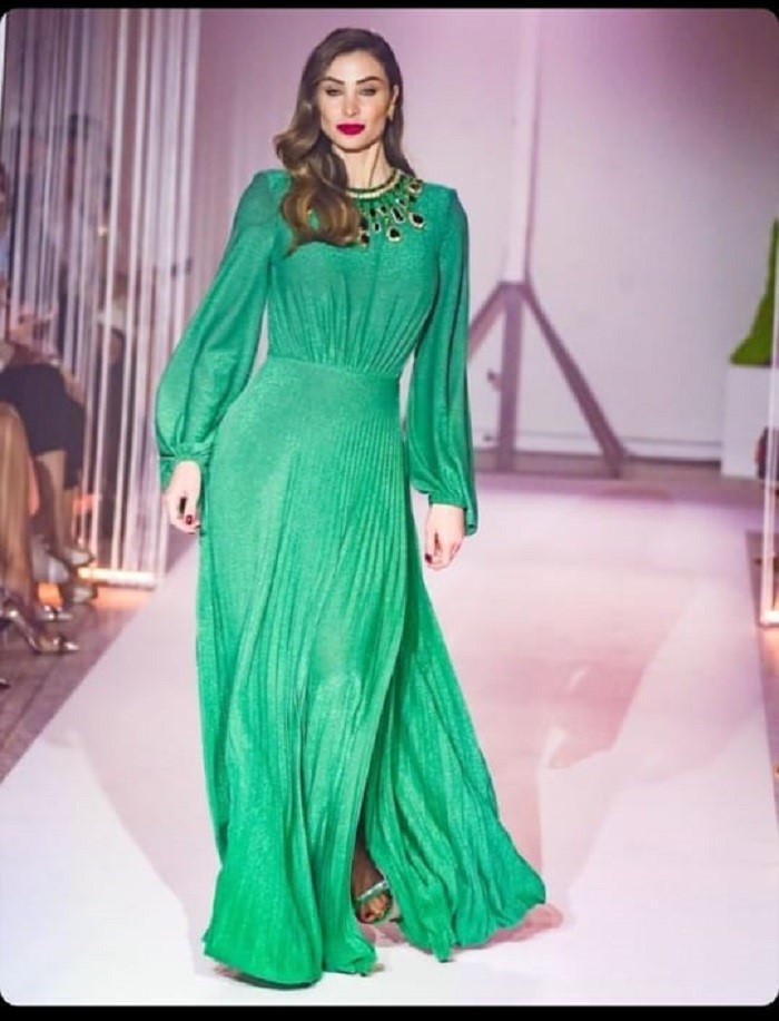وتألقت أنابيلا هلال خلال افتتاحها لعرض الأزياء، بفستان باللون الأخضر، بخامة من الشيفون الثقيل، وتركت شعرها في تموجات حريرية ذهبية، وأكملت إطلالتها بأحمر شفاه أحمر فاقع.