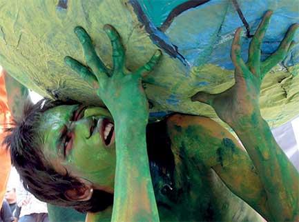 أحد نشطاء البيئة يقوم بالتمثيل في عرض فني ناشط للبيئة، خلال تظاهرة في بورصة جاكارتا، في العاصمة الإندونيسية، أمس، حيث تظاهرت مجموعة من الناشطين ، بهدف حث الحكومة الإندونيسية على رفض الديون غير الشرعية، والديون الاقتصادية الحيوية، والمعروفة بالإكولوجية، والحث على الاستثمار البيئي.