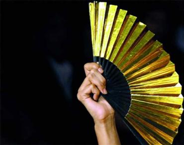 عارضة تتهادى أمام عدسات كاميرات المصممين بمهفّة ذهبية، وابتكار من تصميم مصممة الأزياء الهندية ماليني راماني، خلال عرض أزياء تابع لحدث «شيفاز في جولة أزياء 2008».