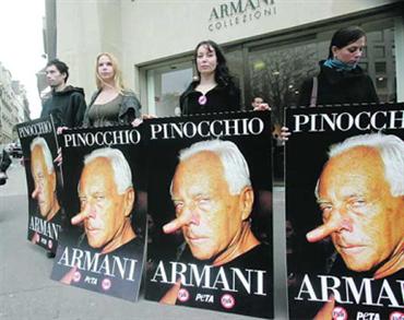 ناشطات في منظمة الرفق في الحيوان «بيتا» يحملن صوراً لمصمّم الأزياء الإيطالي جورجيو أرماني مع تغيير شكل أنفه إلى آخر شبيه بالشخصية الكرتونية الشهيرة بالكذب «بينوكيو» وتغيير اسمه إلى «بينوكيو أرماني»، في محاولة للتظاهر ضد استخدام المصمّم للفرو الحقيقي، وذلك أمام باب دار أزياء المصمّم في العاصمة الفرنسية باريس.