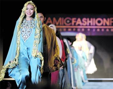 عارضات يقدمن عدداً من ابتكارات مصمم الأزياء الإندونيسي، رونالد غاغهانا، خلال عرضه لمجموعة من تصاميمه خلال افتتاح مهرجان الأزياء الإسلامية في العاصمة الماليزية كوالالمبور، أمس.
