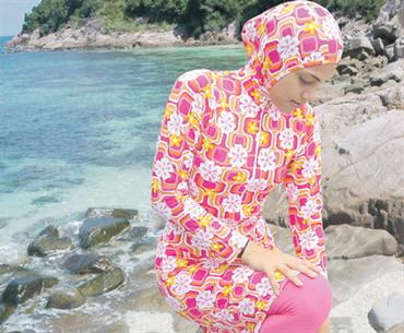 ويتكون «المايوه الشرعي» من بنطلون وبلوزة ذات أكمام طويلة ملتصق بها غطاء للرأس.