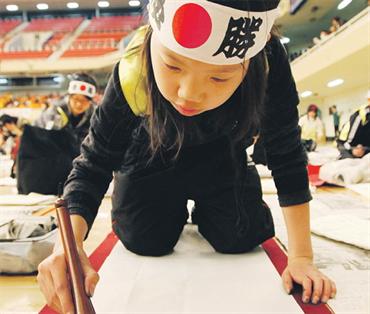 طفلة مشاركة في مسابقة الخط السنوية «كاكيزوم» التي تُنظم سنوياً في مطلع كل عام جديد في طوكيو، ويشارك فيها سنوياً نحو 3000 شخص، و«كاكيزوم» تقليد كان نبلاء البلاط المسؤولون عن فن الخط يقومون به، وانتشر بين الشعب الياباني قبل 200 عام.