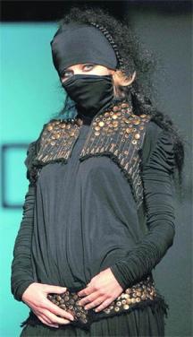 عارضة تقدم أحد ابتكارات جامعة أسمود لتصميم الأزياء في تونس خلال أسبوع تونس للأزياء الإثنين الماضي في تونس.