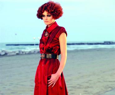 عارضة تقدم أحد ابتكارات المصمم العالمي كارل لاغرفيلد لدار أزياء شانيل في عرض أزياء على شاطئ البحر في إيطاليا أخيراً.