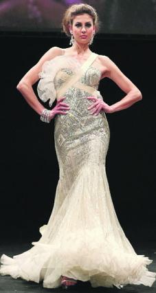 عارضة تقدم ثوباً لمصمم الأزياء المصري هاني البحيري في عروض أزياء الصيف في العاصمة الإيطالية روما.