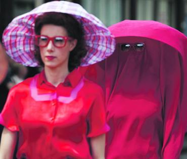 عارضون على منصة بطول ثلاثة كيلومترات خلال عرض «خط أحمر للأزياء»، والذي أقيم أول من أمس لإضفاء بهجة على شوارع في وسط لاهاي في هولندا.