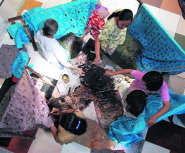 عمّال وعاملات إندونيسيّون في مدينة سولو المعروفة بمنتجاتها من المطرّزات القطنية اليدوية المخلوطة بالشمع المذاب.