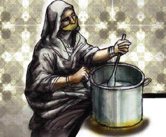1- يسخن الزيت في قدر، ويوضع فيه البصل والبطاطس المقطع مدة خمس دقائق، حتى تتحول إلى اللون الذهبي.