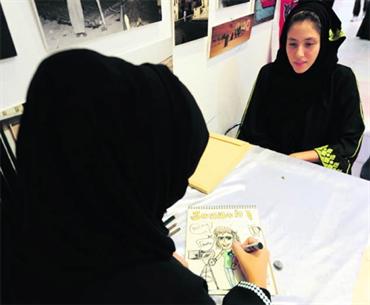 سعوديات يبعن منتجات مصنوعة يدوياً، من رسوم وإكسسوارات، في بازار رمضاني في واحد من مراكز التسوق في جدة، أول من أمس، ضمن حدث يضم أنشطة أخرى خلال شهر رمضان سنوياً.